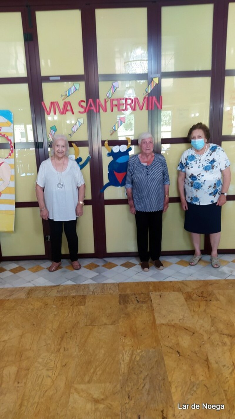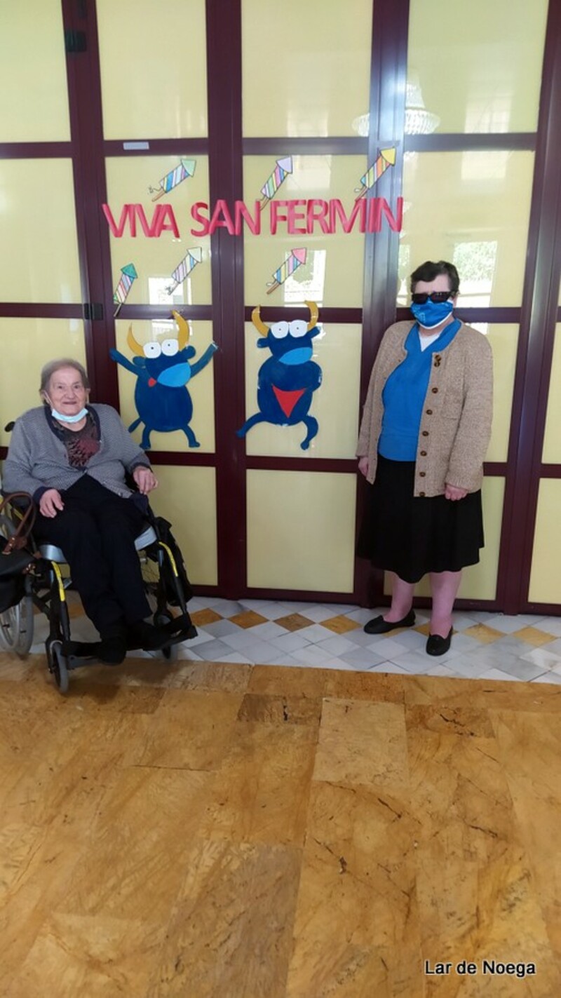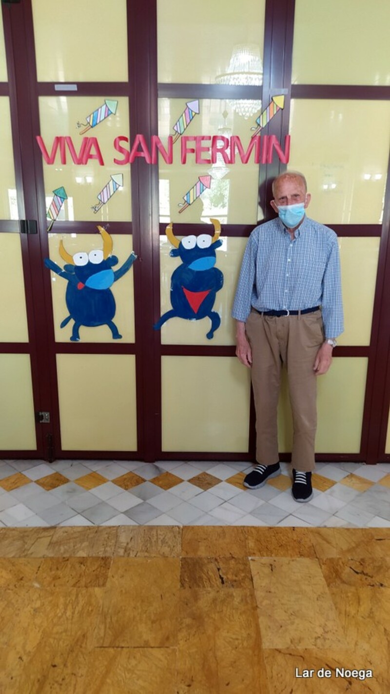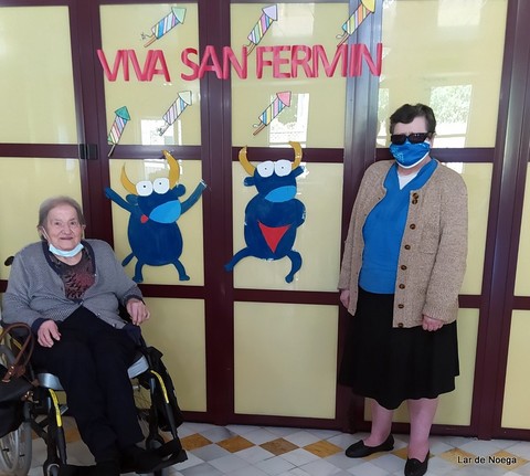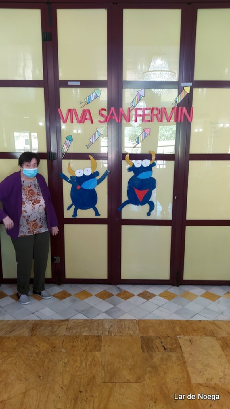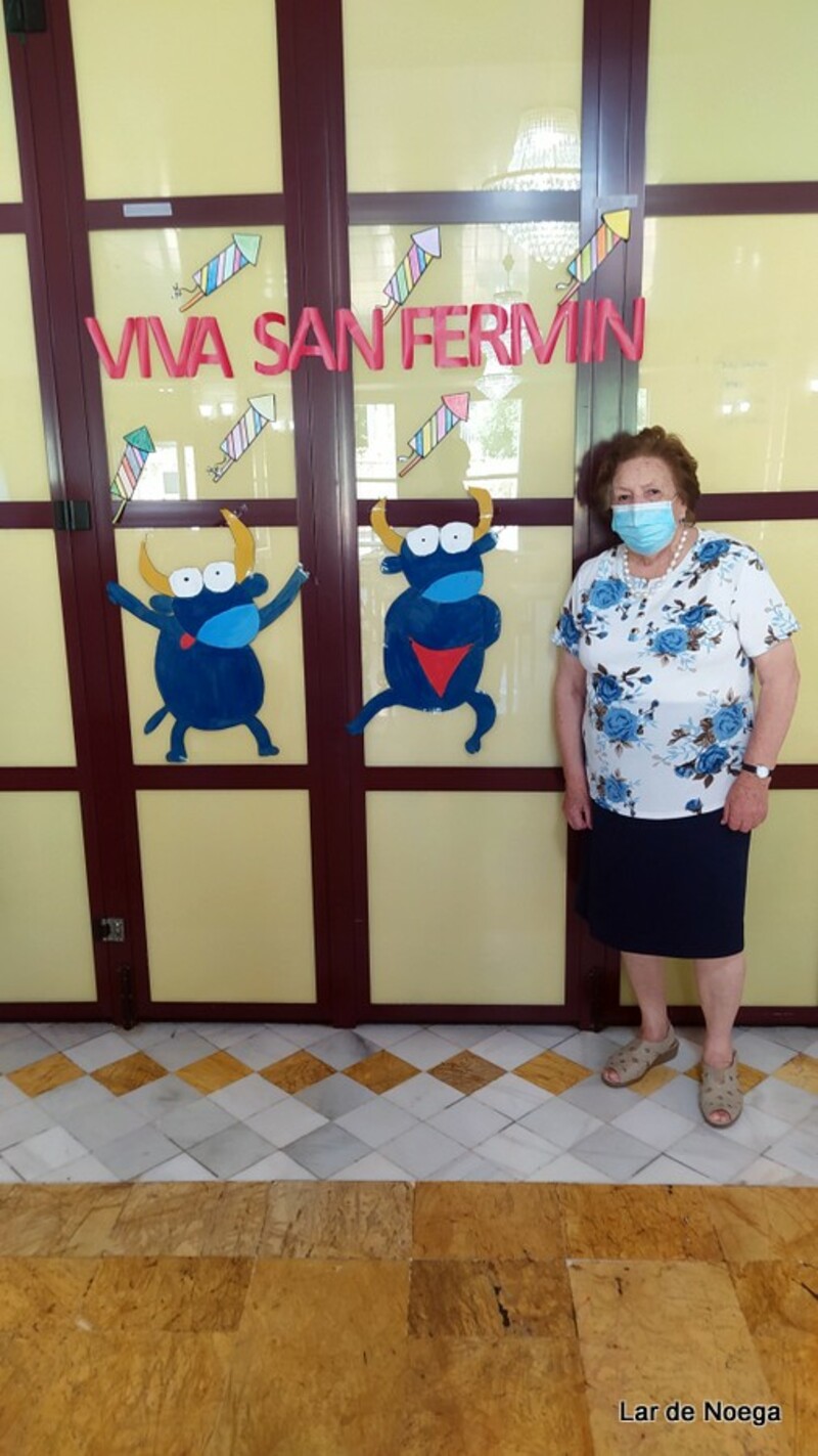 Durante estos días nuestros residentes han querido unirse a la fiesta realizando para la ocasión una decoración muy especial. Entre todos hemos pintado unos toros con el típico pañuelo rojo, unos voladores simulando el chupinazo, y la frase: ¡Viva San Fermín!