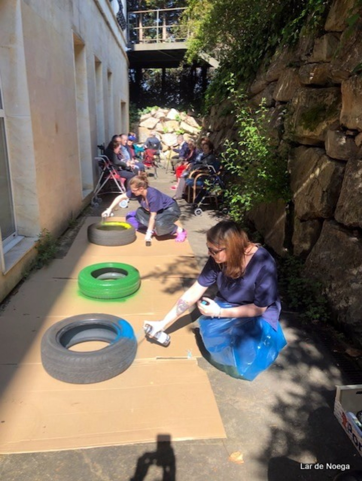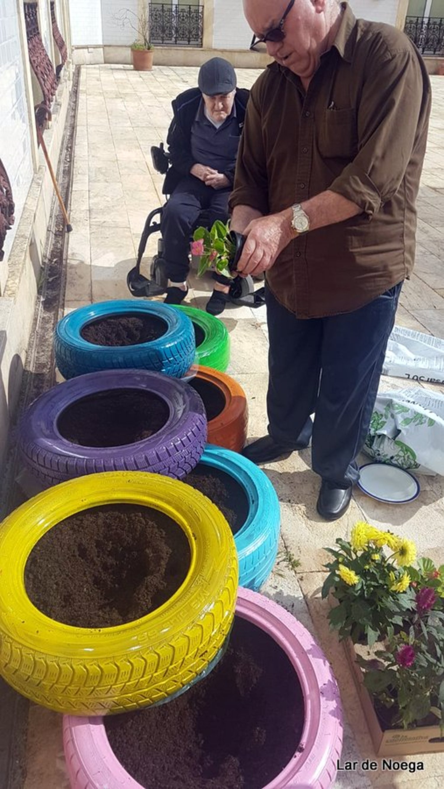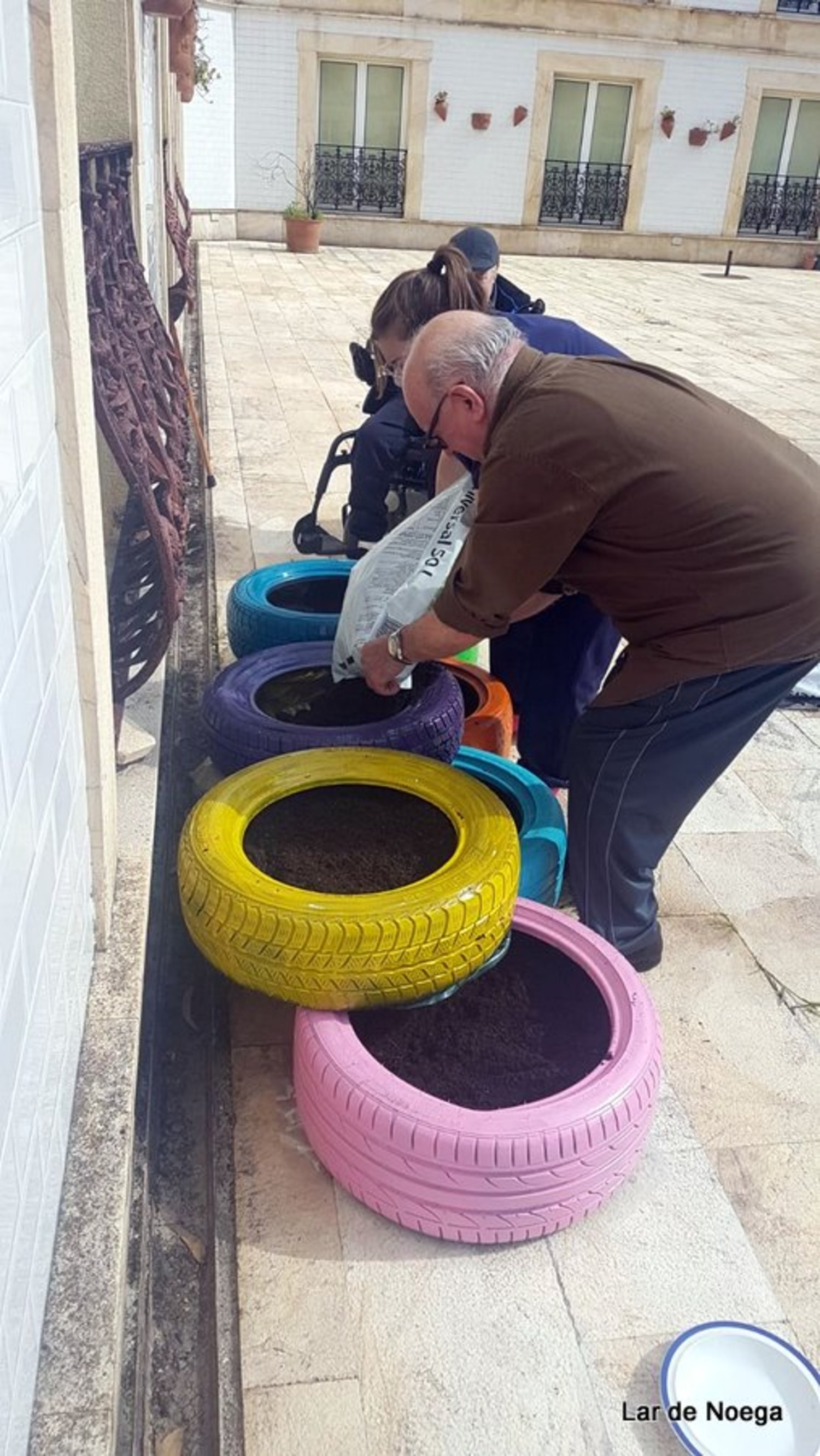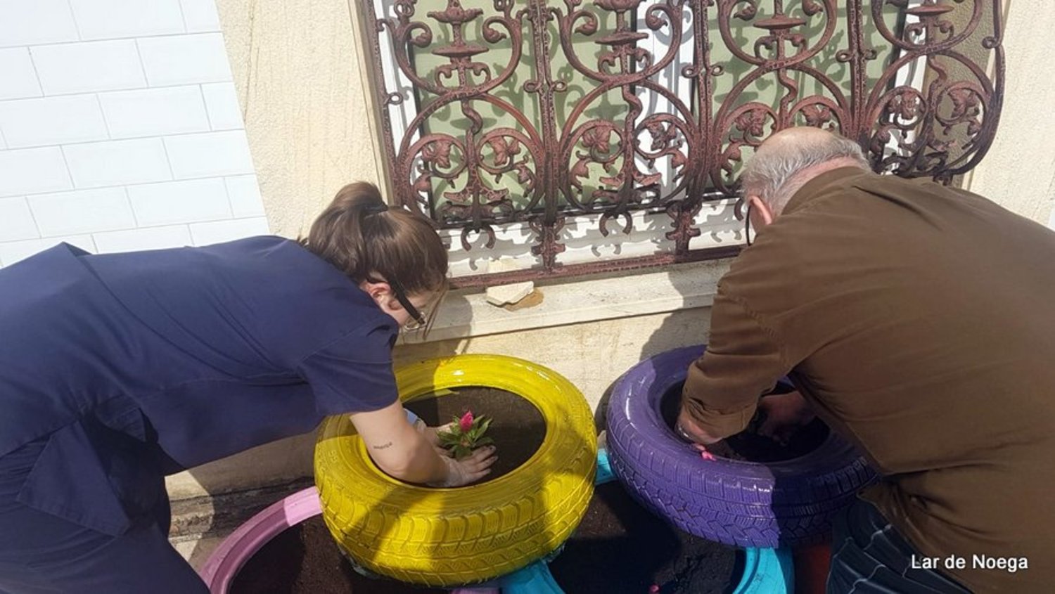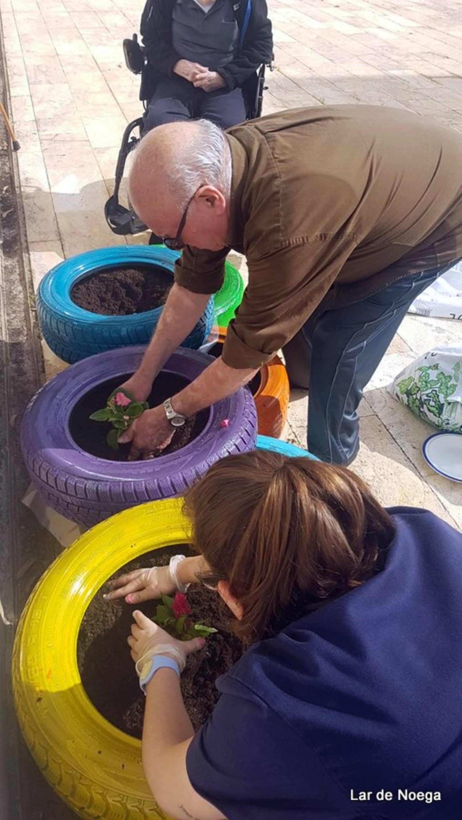 Una de las actividades más fascinantes que realizamos con nuestros residentes en Lar de Noega es el cuidado de plantas y flores. Pero en esta ocasión, hemos querido introducir la idea del reciclaje, utilizando viejos neumáticos.